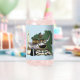 Un petit dragon vert mignon dormant sur des livres avec son ours en peluche, sa bougie, son stylo en plumes et ses lunettes de lecture dans un décor bleu