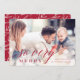 Élégante carte de vœux photo avec une photo orientée paysage en plein saignement avec un effet de flare de lumière bokeh pour un look festif et pétillant. "Très joyeux" est superposé en script rouge canneberge festif et en lettres majuscules, avec votre/vos nom(s) et message personnalisé à côté. Ajoutez deux photos supplémentaires au verso, ainsi qu'un message personnalisé, sur un fond à motif botanique rouge et crème.