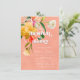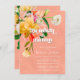 Bright and Bold Brunch et Bubbly Fête des mariées florale ou de douche bébé invitations. Botanique florale brillante et audacieuse avec des couleurs jaune, pêche, rose et blanc contre un arrière - plan tourbé de corail pêche. Merveilleux pour un printemps, été, Baby shower boho ou jardin, douche nuptiale ou toute occasion avec brunch et champagne!