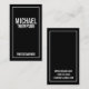 Bold Black and White Business Card featuring information in white bold sans serif font style with white border on black background.