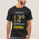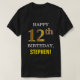 This simple birthday-themed, black-coloured shirt design features a warm birthday wish like "HAPPY 12th BIRTHDAY, STEPHEN!" on the front, in bold text. The birthday number has a faux/imitation gold-like colouring look. The name on the front can be personalized. A shirt like this could be fun to wear at a birthday party being held for somebody who is celebrating their twelfth birthday. [~Z0000318]