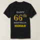 This simple birthday-themed, black-coloured shirt design features a warm birthday wish like "HAPPY 66th BIRTHDAY, REGINALD!" on the front, in bold text. The birthday number has a faux/imitation gold-like colouring look. The name on the front can be personalized. A birthday-themed shirt like this could be a fun way to deliver birthday wishes to somebody who is celebrating their sixty sixth birthday. [~Z0000318]