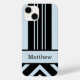 Black and grey chevrons of various widths point up to the customizable name banner in the bottom third of the design. Thick and thin vertical black and bright blue stripes fill the top of the iPhone cover.