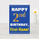 Ce simple design de carte de voeux sur le thème de l'anniversaire présente un voeu d'anniversaire chaleureux comme "HAPPY 2nd BIRTHDAY, First-Name!" sur le devant, en texte gras sur un arrière - plan de couleur bleue. Le numéro d'anniversaire a une apparence de coloration fausse/imitation or. Le nom sur le devant peut être personnalisé. L'intérieur comporte un message d'anniversaire qui peut être customisé. Une carte de voeux comme celle-ci pourrait être une façon amusante de transmettre des voeux d'anniversaire à quelqu'un qui célèbre son deuxième anniversaire. [~Z0000278]