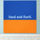 Sharing a favourite place to go in summer - to the shore. This bright, modern, abstract minimalist design features colour and words to evoke a sense of place. The bottom third of the canvas is drenched in bright warm orange, the top in rich, deep blue. The optional text "Sand and Surf" is written in playful typography at the bottom of the blue sea colour block and can be personalized. A little open clam drawing rests at the intersection of sea and beach.