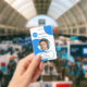 Photo ID badge featuring your custom photo and logo on a colourful blue white retro design. The lower text area on the front shows a rectangular shape, which you can scale in the advanced editor. On the back you can add a custom bar code or QR code and additional texts (or delete the templates). Great to create an eye-catching presence.