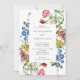 A colourful modern floral wedding invitation featuring a rectangular frame overlaying large watercolor flowers in blue, yellow, white, red and pink on a white background.