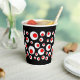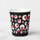 These paper cups have a bold geometric circle abstract design red circles in bigger white circles on a black background.