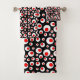 This set of bath towels that includes a wash towel, hand towel, and bath towel has an abstract design of bold circular geometric circles. Bright red circles inside white circles on a black background. Purchase the whole set or individually.