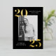 Modern graduation party invitations featuring the graduate's vertical photo framed in black with 2025 in bold, gold foil lettering at the top left and bottom right corners. Personalize the front of the photo graduation party invites with the graduate's name and school name. The foil graduation invitation reverses to display your party details in white lettering with a black background. The background colour can be changed to a colour of your choice with our edit design feature. The black and gold graduation party invites work perfectly for both high school and college graduation parties.