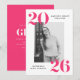 Invite guests to your graduation party with our modern Bold 2025 graduation party invitations. The stylish graduation party invites display the graduate's photo framed in white with 2025 in bold hot pink lettering at the top left and bottom right corners. Personalize the front of the photo graduation party invites by adding the graduate's name & school name. The invite reverses to display your party details in white lettering against a solid hot pink background.