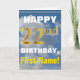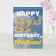 This simple birthday-themed greeting card design features a warm birthday wish like "HAPPY 22nd BIRTHDAY, First-Name!" on the front, in bold text on a background depicting a blue sky with white and gray clouds. The birthday number has a faux/imitation gold-like coloring look. The name on the front can be customized. The inside features a birthday message that can be personalized. A greeting card like this could be a fun way to deliver birthday wishes to somebody who is celebrating their twenty second birthday. [~Z0000284]