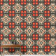 This peel and stick wallpaper features a captivating design with bold colours and intricate patterns. The dominant colours are black, red, orange, and white. The red flowers have orange centres, creating a vibrant contrast against the dark background. The graphic style leans toward folk art. It feels handcrafted, as if someone painted it directly on the wall. The organic shapes and imperfect outlines give it an authentic, free-spirited vibe. The repeating pattern includes stylized floral motifs and tear-shaped elements. The flowers are interconnected by delicate black lines, forming an intricate network.