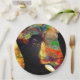 Paper plates with an elephant head in bold vibrant colours of yellow, green, orange and more giving it a random abstract look to it. Set on a black background.