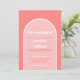 Bold Coral Pink Arch Monogram Wedding Invitation. Make a statement with this simple, minimalist wedding invitation featuring a bold coral pink background and a dusty pink arch design. The wedding details are highlighted in white and coral fonts, set against a dusty rose or blush pink arch with a white border for a sophisticated, retro-inspired touch.