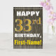 This simple birthday-themed greeting card design features a warm birthday wish like "HAPPY 33rd BIRTHDAY, First-Name!" on the front, in bold text on a faux wood appearance pattern background. The birthday number has a faux/imitation gold-like colouring appearance. The name on the front can be personalized. The inside features a birthday message that can be personalized. A greeting card like this could be a fun way to deliver birthday wishes to somebody who is celebrating their thirty third birthday. [~Z0000280]
