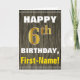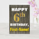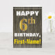 This simple birthday-themed greeting card design features a warm birthday wish like "HAPPY 6th BIRTHDAY, First-Name!" on the front, in bold text on a faux wood appearance pattern background. The birthday number has a faux/imitation gold-like colouring look. The name on the front can be customized. The inside features a customizable birthday message. A greeting card like this could be a fun way to deliver birthday wishes to somebody who is celebrating their sixth birthday. [~Z0000280]