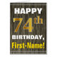 This simple birthday-themed greeting card design features a warm birthday wish like "HAPPY 74th BIRTHDAY, First-Name!" on the front, in bold text on a faux wood appearance pattern background. The birthday number has a faux/imitation gold-like colouring look. The name on the front can be personalized. The inside features a birthday message that can be personalized. A greeting card like this could be a fun way to deliver birthday wishes to somebody who is celebrating their seventy fourth birthday. [~Z0000280]