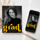 Stylish graduation announcements featuring the graduate's vertical photo with "grad" in bold yellow lettering. Personalize the photo graduation announcement by adding the graduate's name, graduation year, and school. The announcement reverses to display a yellow and white retro arch pattern.