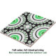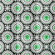This ceramic tile features intricate patterns that radiate outward from the centre, creating a captivating kaleidoscope effect. The dominant colours are black, white, and a striking shade of green. The black and white form the base of the design, with symmetrical shapes including triangles and rectangles. These monochromatic elements provide a stark contrast to the vibrant green shapes, which appear to be stylized floral or sun designs, interspersed within the geometric patterns. The design is symmetrical, with repeating elements that create a sense of harmony and balance. This symmetry, combined with the bold colour palette and intricate detailing, gives the tile a modern and stylish appeal. It’s a versatile piece that could complement various interior styles, from contemporary to eclectic.