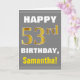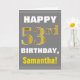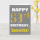 Ce simple design de carte de voeux sur le thème de l'anniversaire présente un voeu d'anniversaire chaleureux comme "HAPPY 53rd BIRTHDAY, Samantha!" sur le devant, en texte gras sur un arrière - plan gris (gris). Le numéro d'anniversaire a une apparence de coloration fausse/imitation or. Le nom sur le devant peut être personnalisé. L'intérieur comporte un message d'anniversaire personnalisable. Une carte de voeux comme celle-ci pourrait être une façon amusante d'offrir des voeux d'anniversaire à quelqu'un qui célèbre son cinquante-troisième anniversaire. [~Z0000283]