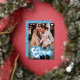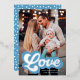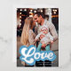Cute Valentine's day photo card featuring "Love" displayed in a light blue and silver foil retro script. Personalize the front of the foil Valentine's day card with your vertical photo, custom greeting, and name. The back of the photo Valentine's day card features a blue and white heart pattern.