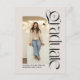 Modern and stylish, this two-photo graduation announcement and graduation party invitation postcard is perfect for the bold and trendy graduate. Featuring a unique arched photo on the front with bold modern type, this design also has room on the back for a second photo and graduation party invitation text. The text on the back can also be used for a thank you message, future plans and more. This combination graduation announcement and graduation party invitation is perfect for high school or college grads and works well for guys or girls. The front photo is vertical on an off-white background and the back is horizontal. Find coordinating pieces and more colours in the collection by Lea Delaveris Design.