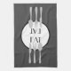 Bold modern grey and white cutlery design with editable text kitchen towel. Art copyrights Ann Powell all rights reserved