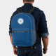 Blue backpack features a bold blue monogram in a white circle with a narrow blue border and a thin outer white ring. Add your initial in the sidebar.