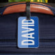 Personal name tag. Have your choice of name shown boldly on a two-tone luggage tag. Example shows the name David. Personalise with your choice of short name.