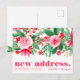 Bold new address Christmas winter moving announcement. With a contemporary bold font typography with hand painted red and green floral Christmas with roses, poinsettias and green pine tree branch and holly berries loose floral watercolor,