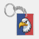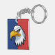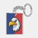 This keychain features a determined cartoon-style eagle head design against a vibrant blue and red background.