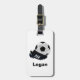 Front of luggage tag contains a black and white soccer ball and shoes. Soccer player's name is written below. The back has the contact info. It is black with a white font.
