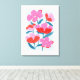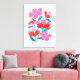 A striking contemporary art print featuring stylized flowers with large, bold petals in shades of pink and vibrant red, contrasted with deep teal leaves and stems. Set against a light blue background, this illustration has a modern, almost risograph-like aesthetic, perfect for adding a pop of colour to any space.