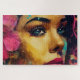 Bold and vibrant, this artistic portrait showcases a woman's captivating gaze with striking blue eyes and vibrant pink hibiscus floral accents. The splashes of colour in the background bring an abstract, modern twist. This image exudes emotion and creativity, perfect for those who appreciate expressive and colourful artwork. This puzzle a perfect gift for Birthday's, Christmas, or for family night.