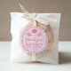 This stylish favour sticker design features 3 hand-drawn kissy lips icons against a boho wavy pink striped background with a circular wavy doodle style border. Shown here for a thank you favour sticker but all of the text fields are flexible to your needs. All colours of all elements can be changed by you from inside the design tool.