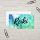 The white Reiki typography text is on a Bold Colorful Mint Green Turquoise Blue and white abstract bubbles watercolor design.