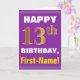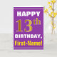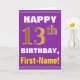 This simple birthday-themed greeting card design features a warm birthday wish like "HAPPY 13th BIRTHDAY, First-Name!" on the front, in bold text on a purple coloured background. The birthday number has a faux/imitation gold-like colouring appearance. The name on the front can be personalized. The inside features a customizable birthday message. A greeting card like this could be a fun way to deliver birthday wishes to somebody who is celebrating their thirteenth birthday. [~Z0000277]