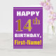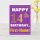 This simple birthday-themed greeting card design features a warm birthday wish like "HAPPY 14th BIRTHDAY, First-Name!" on the front, in bold text on a purple coloured background. The birthday number has a faux/imitation gold-like colouring appearance. The name on the front can be personalized. The inside features a birthday message that can be customized. A greeting card like this could be a fun way to deliver birthday wishes to somebody who is celebrating their fourteenth birthday. [~Z0000277]