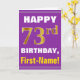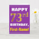 This simple birthday-themed greeting card design features a warm birthday wish like "HAPPY 73rd BIRTHDAY, First-Name!" on the front, in bold text on a purple coloured background. The birthday number has a faux/imitation gold-like colouring look. The name on the front can be customized. The inside features a birthday message that can be personalized. A greeting card like this could be a fun way to deliver birthday wishes to somebody who is celebrating their seventy third birthday. [~Z0000277]