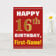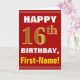 Ce simple design de carte de voeux sur le thème de l'anniversaire présente un voeu d'anniversaire chaleureux comme "HAPPY 16th BIRTHDAY, First-Name!" sur le devant, en texte gras sur un arrière - plan de couleur rouge. Le numéro d'anniversaire a un look de couleur imitation or. Le nom sur le devant peut être personnalisé. L'intérieur comporte un message d'anniversaire personnalisable. Une carte de voeux comme celle-ci pourrait être une façon amusante d'offrir des voeux d'anniversaire à quelqu'un qui célèbre son seizième anniversaire. [~Z0000276]
