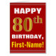 This simple birthday-themed greeting card design features a warm birthday wish like "HAPPY 80th BIRTHDAY, First-Name!" on the front, in bold text on a red coloured background. The birthday number has a faux/imitation gold-like colouring appearance. The name on the front can be customized. The inside features a birthday message that can be customized. A greeting card like this could be a fun way to deliver birthday wishes to somebody who is celebrating their eightieth birthday. [~Z0000276]