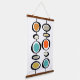 This fabulous mid century modern hanging tapestry features two sets of abstract hanging circles in the colours of turquoise blue, two shades of orange, cream, avocado green, gold, and black. This will make a bold statement in your home decor!