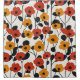 The image features a vibrant floral pattern with stylized red and orange flowers, each with bold black centres. The flowers are connected by thin black stems and leaves, all set against a light background. The design is minimalistic yet striking, evoking a retro or mid-century modern aesthetic with its clean lines and contrasting colours.