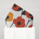 The image features a vibrant floral pattern with stylized red and orange flowers, each with bold black centres. The flowers are connected by thin black stems and leaves, all set against a light background. The design is minimalistic yet striking, evoking a retro or mid-century modern aesthetic with its clean lines and contrasting colours.