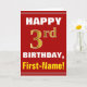 Ce simple design de carte de voeux sur le thème de l'anniversaire présente un voeu d'anniversaire chaleureux comme "HEUREUX 3ème anniversaire, prénom!" sur le devant, en texte gras sur un arrière - plan de couleur rouge. Le numéro d'anniversaire a un look de couleur imitation or. Le nom sur le devant peut être customisé. L'intérieur comporte un message d'anniversaire personnalisable. Une carte de voeux comme celle-ci pourrait être une façon amusante d'offrir des voeux d'anniversaire à quelqu'un qui célèbre son troisième anniversaire. [~Z0000276]