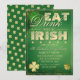 A vibrant St. Patrick’s Day invitation featuring bold typography, shimmering gold accents, and festive shamrock details set against a rich green background. The design blends celebratory energy with classic holiday charm, creating a lively and eye‑catching layout perfect for Irish‑themed gatherings and seasonal events.