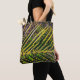 This Tote Bag features original, abstract artwork by ZoeSPEAK, made from an original photograph of a reclinata palm frond. The strong Florida sun highlights the leaves, which grow out from the spine like stripes in diagonal rows. The lawn, in soft focus, forms the green background.