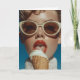 A striking, retro-inspired close-up of a glamourous woman in oversized sunglasses enjoying a creamy ice cream cone under the sun. The image features bold red lipstick, flawless skin, and a stylish waffle-knit sweater, embodying vintage fashion with a modern twist.