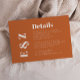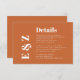 This wedding details enclosure card features the title "Details" and the couple's monogram initials in bold, minimalist typography, with the remaining text in white modern sans serif font on a burnt orange background.